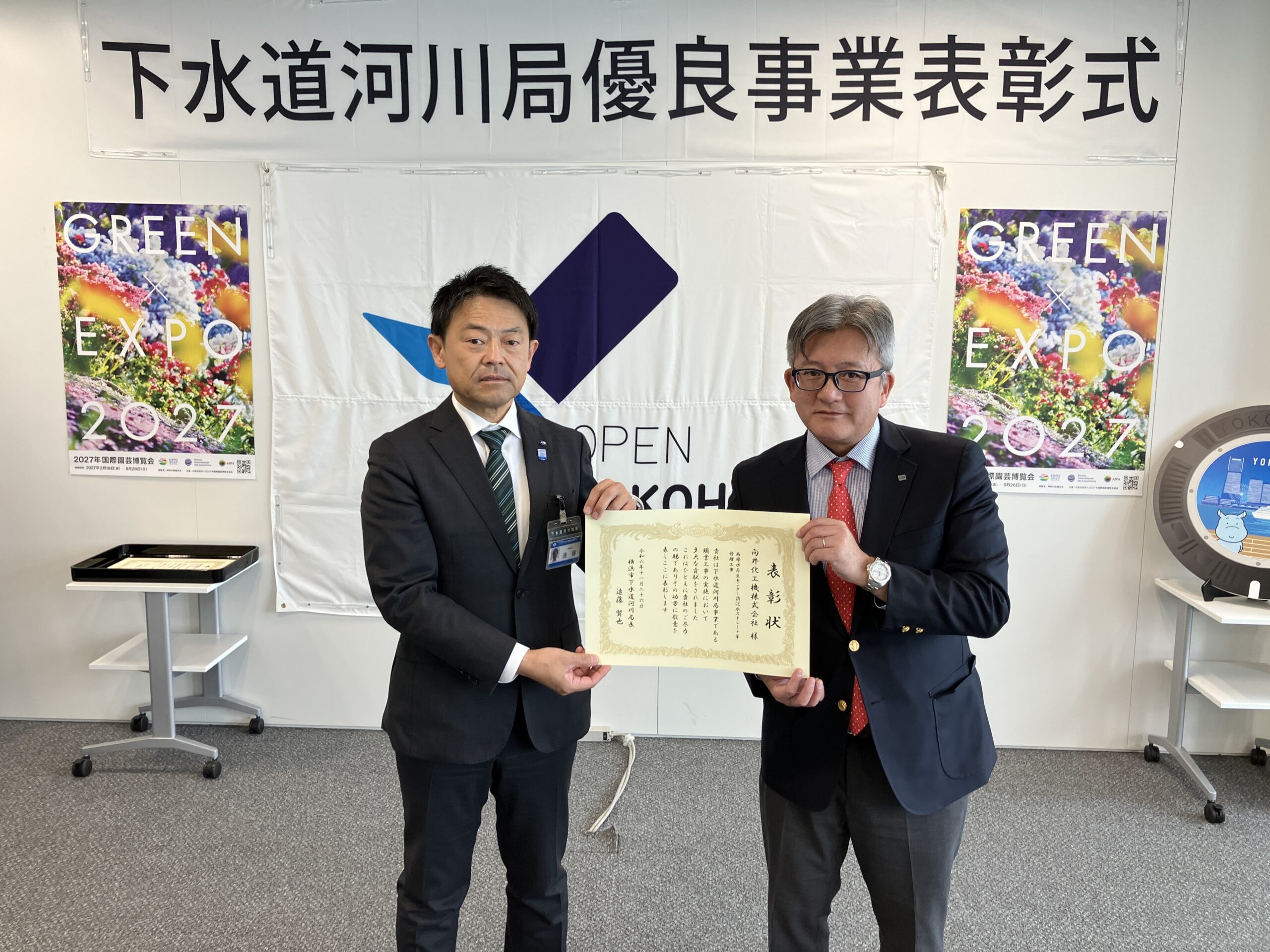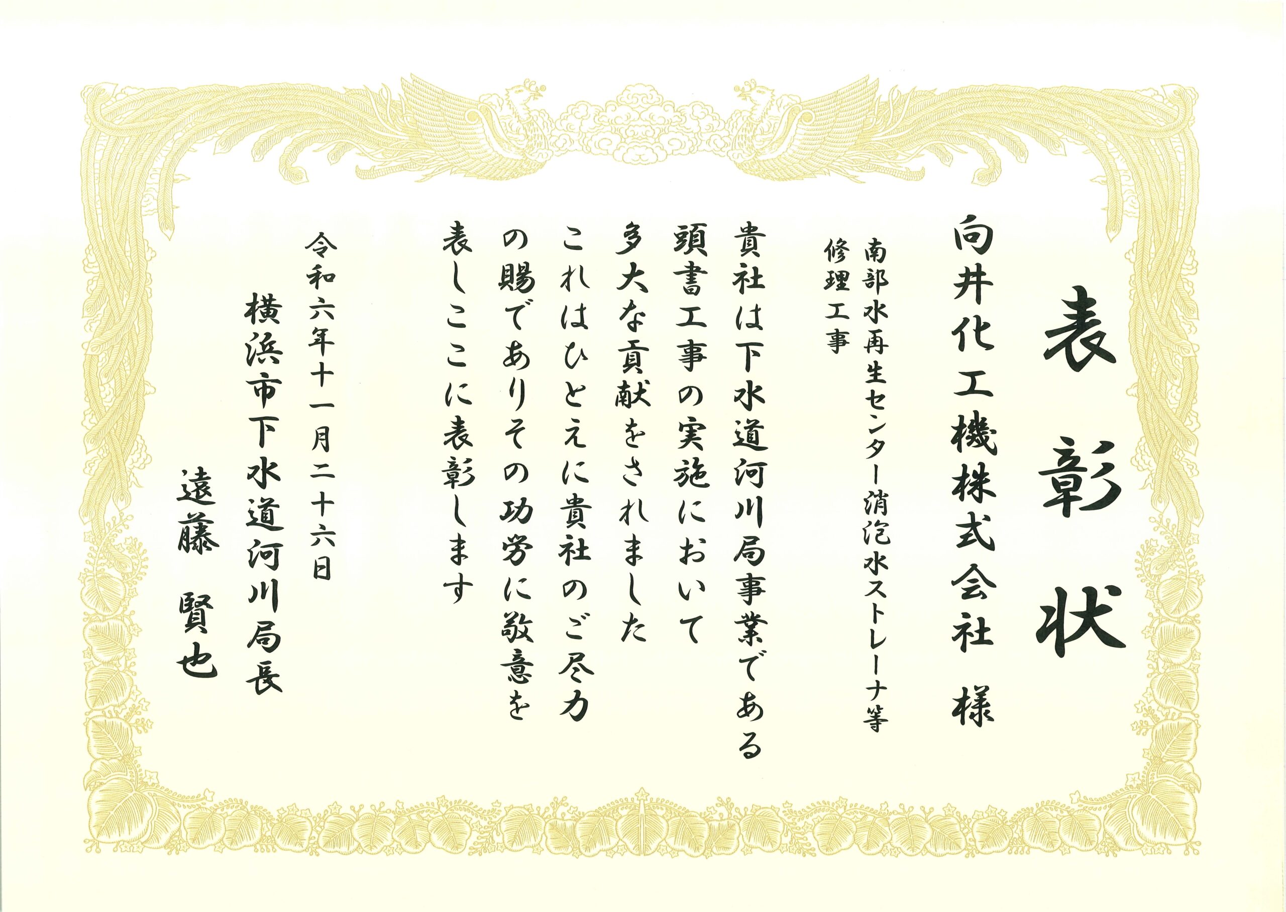 このたび、令和6年度「下水道河川局優良事業表彰」において、当社子会社である向井化工機株式会社が、南部水再生センターにおける「消泡水ストレーナ等修理工事」で高い評価を受け、横浜市下水道河川局より表彰されました。